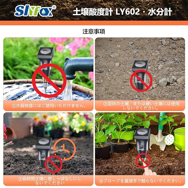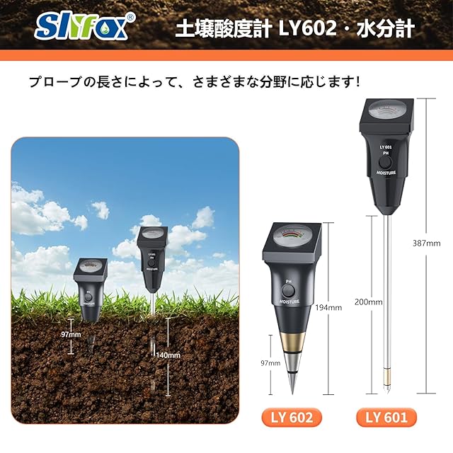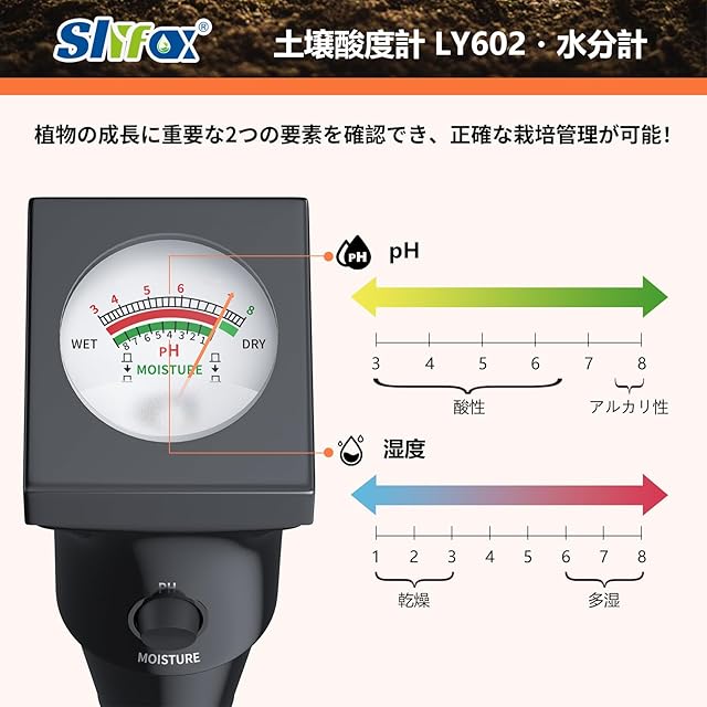 Slyfox 土壌酸度・湿度計 起電式土壌測定器 電池不要 高精度 pH測定器 水遣りチェッカー 日本語説明書付き【太】