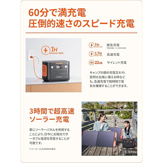 【多様な充電方式と充電モード】「緊急充電モード」では約60分でフル充電、「高速充電モード」では約1.7時間でフル充電が可能です。ACコンセント、カーチャージャー(別売)、ソーラーパネルなど、さまざまな充電方法に対応し、あらゆるシーンで迅速に充電できます。