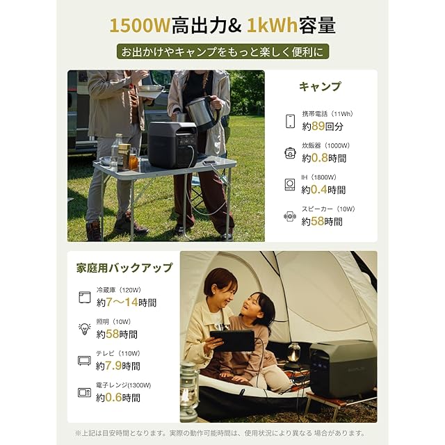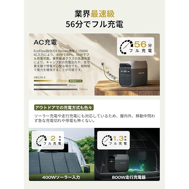 「 1,500W AC入力、56分で100%充電」EcoFlowのX-Stream充電テクノロジーと1,500WのAC入力を使用すると、40分で80%、56分で100%充電できます。家庭用バックアップ電源として最適であり、停電の前に56分でバッテリーを満充電にできます。アウトドアキャンプの場合、出発前夜または出発当日の朝にバッテリーを完全充電可能なので、予定時間に遅れずに準備を整えられます。