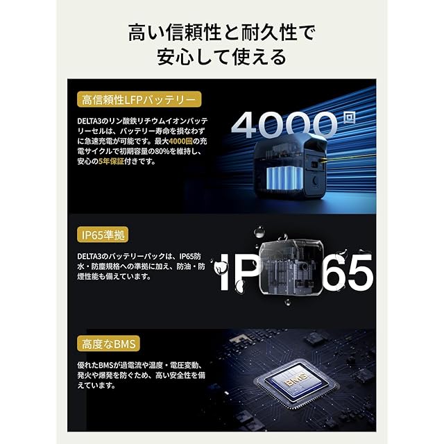 「 寿命は10年間、X-Guardによる三重保護」5年の保証を与えられ、10年の寿命を誇るEcoFlowのLiFePO4バッテリーセルは、バッテリー寿命を損なわずに急速充電を実現します。最大4,000回のサイクルで容量を80%保持し、業界標準を25%も上回ります。