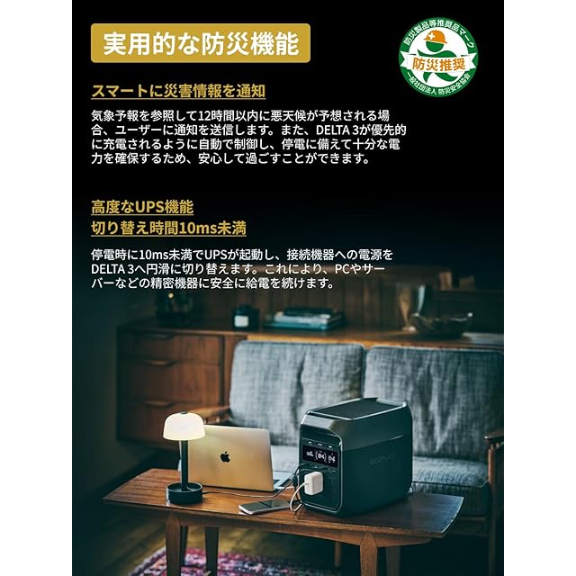 「 <10msで切り替わる高性能UPS&スマート発電機との組み合わせで長時間稼働」 DELTA 3 ポータブル電源が搭載する高信頼性UPSは、10ms未満で切り替わります。これはDELTA 2の30ms未満を大きく上回ります。迅速なUPS起動により、突然の停電でもデータ整合性および機器の安全性をシームレスに確保するポータブル電源なのです。さらに、EcoFlowの1.8kWスマート発電機と組み合わせると、バッテリー残量を心配せずに長時間稼働が可能です。