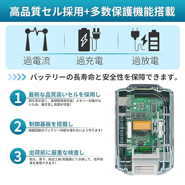 【高品質&低不良率】PSE、CE取得済み、バッテリー内部に制御基盤に過電流、過電流保護、過充電防止、過放電防止などの機能が付いておりますので、長くご利用いただけます。万全な品質管理が行き届いた専門工場で製造されて、着脱検査、耐久性などを十分に正規テストされますので、低不良率を実現できます。弊社の商品では1年間の保証付きますから、ご使用中問題があれば、いつでもお問い合わせください。必ず12時間内で返信致します。