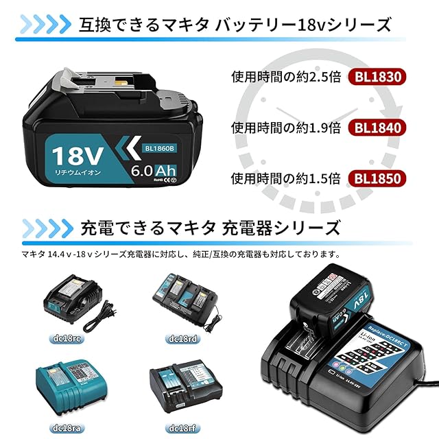 【純正と完全な互換性】マキタ バッテリー 18v :BL1815N BL1820B BL1830B BL1840B BL1850B BL1860B BL1890B 194205-3 194230-4 LXT400 マキタ 充電器 DC18RA、DC18RC、DC18RD、DC18SD、DC18RFなどに対応できます。弊社製の充電器DC18RC DC18RD DC18RFも対応しております。