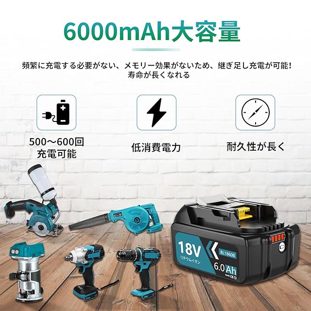 【 6000mAh超高容量】他の小容量バッテリーに比べ、当社のBL1860Bは6000mAhの大容量で、大容量は使用時間がもっと長くなります。残量表示機能があり、ボタンを押すだけで現場点検ができます。残量を素早く確認できるので便利です。長時間の作業をサポートし、充電回数を減らし、作業者の作業効率を十分に向上させることができます。