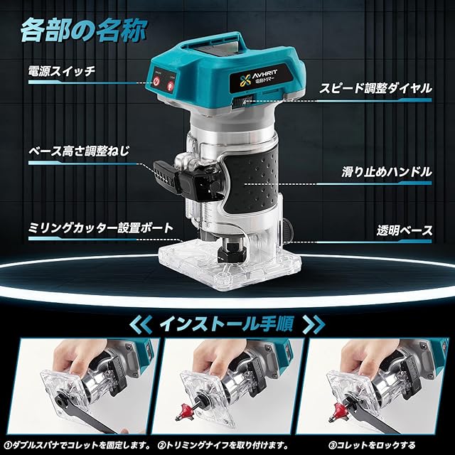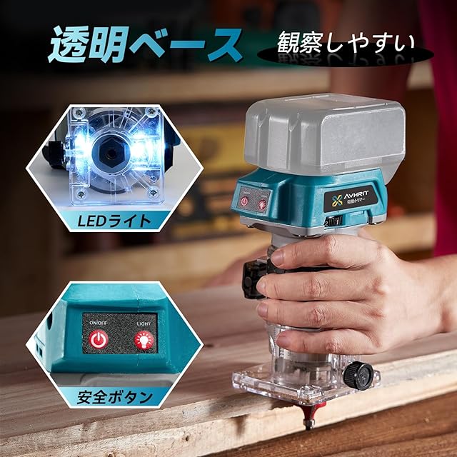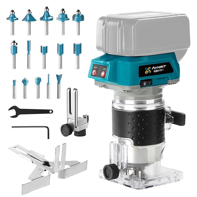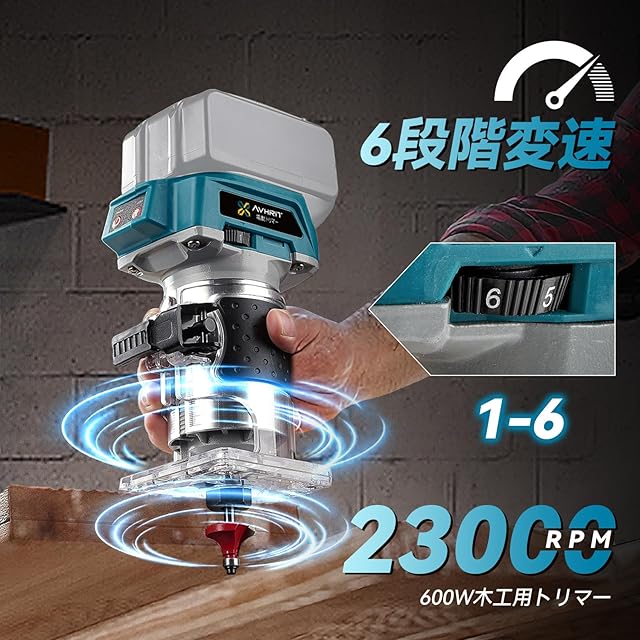 Avhrit 電動トリマー 木工用 電動工具 電気トリミング機 ルーター ハイパワー ブラシレスモーター ビット軸径6mm 日本規格 軽量 切断 彫刻 研磨 木材の面取りや溝切り コードレス マキタ18vバッテリー互換 【本体のみ、バッテリー別売り】