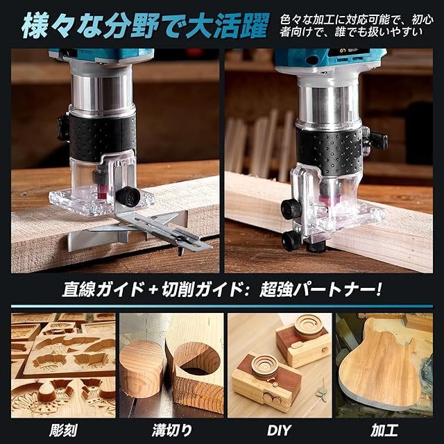 【豊富な付属品&様々な分野に対応】セット内容:電動トリマー 1 台、1/4 インチ(約 0.6 cm)柄木工フライスカッター 15 柄、片口スパナ 2 個、チョウナット 1 個、ストレートガイド一式 (案内定規) 1 セット、トリマガイド 1 個、日本語取扱説明書 1 冊。電動トリマーは木材の面取り、溝切り、トリミング、穴開け、切り抜き、文字彫り、マネ加工など幅広く対応できます。この電動トリマーは利便性が高く、簡単に操作でき、このトリマーを使うことで初心者っぽい DIY から脱出できます。
