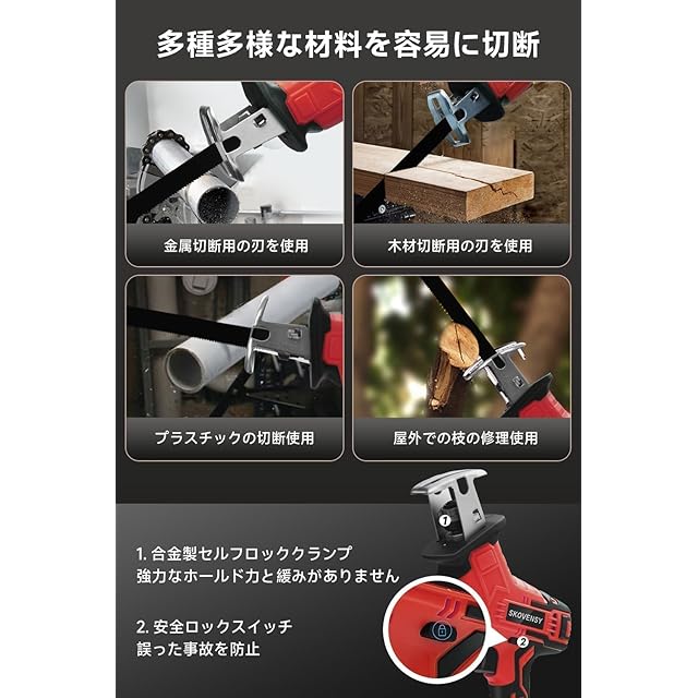 【安全機能付きレシプロソーで安心作業】 誤作動を防ぐ安全ロックボタンを搭載し、安全性を重視した設計。使用中の操作ミスを防ぎ、初心者にも扱いやすいレシプロソーとしておすすめです。使う人の安心と利便性の両立を実現しました。
