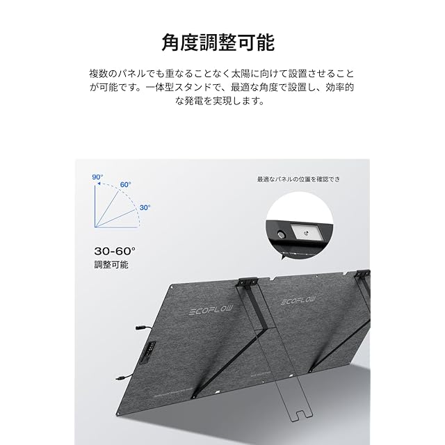 【角度調整・太陽位置測定器付き】パネルの連結部には太陽の位置を確認できる測定器が搭載されており、これを使用して太陽の位置を把握し、30~60°の範囲で簡単に調整できます。最適な角度に調整することで、ソーラーパネルが受け取る太陽光の量を最大化し、効率的な発電が可能になります。設置も使用も非常に便利です。