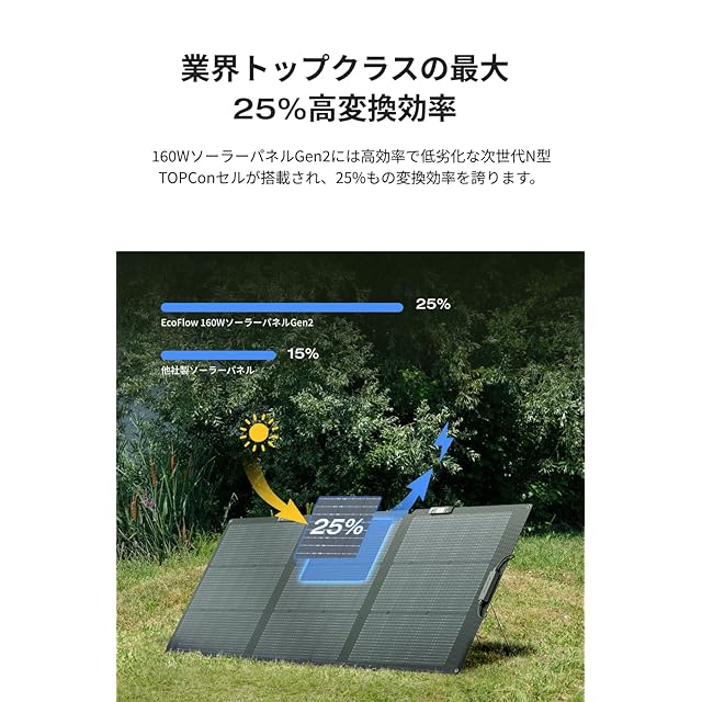【高い発電効率25%を実現】160WソーラーパネルGen2は、高効率で低劣化の次世代N型シリコンセルを搭載しており、25%という優れた変換効率を誇ります。片面受光型ソーラーパネルは、表面からの太陽光だけでなく、裏面でも地面や屋上、大気中の反射光を受けることができ、通常の発電量に加えてさらに発電量を得ることが可能です。