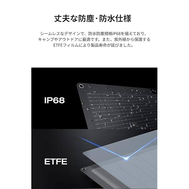 【防水性 & 耐久性】EcoFlow 160Wソーラーパネルは、シームレスな一体型デザインによりIP68レベルの防水性能を実現。キャンプやハイキングなど、あらゆるアウトドア活動に最適です。また、ETFEフィルム構造を採用することで紫外線防護性能が強化され、製品の耐久性と寿命が向上しています。