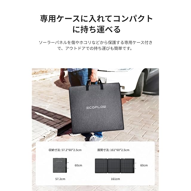 【折り畳み式 & 持ち運びに便利】高効率で太陽光を集めることができ、発電能力が非常に高いため、数日間のアウトドアや災害時の備えとして最適です。折り畳むことでコンパクトかつ軽量化を実現しており、収納時も場所を取りません。また、付属の収納バッグは優れた防水・防塵性能を備えているうえ、利便性も高い仕様です。さらに、折り畳んで角度を調整することで、キックスタンドとしてソーラーパネルを支えることが可能です。展開時サイズ (WxLxH):600x1610x25 mm。折りたたみ時サイズ (WxLxH):600x572x32 mm。