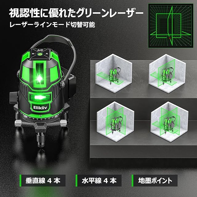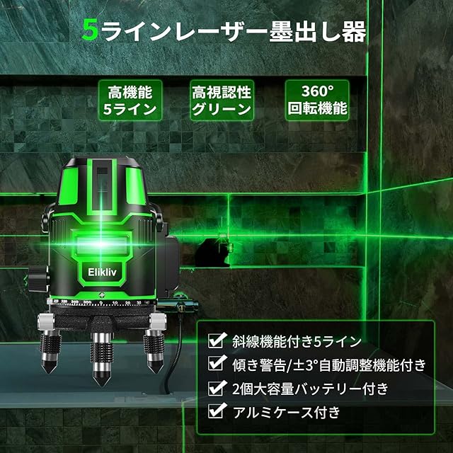 Elikliv レーザー墨出し器 レーザー 水平器 レーザー レベル グリーン 5ライン 4方向大矩照射 360°微調整 大容量バッテリー2個 高輝度 高出力 自動補正 軽天作業 測量建築 DIY 軽量 小型 屋内屋外 アルミケース付き 型番:B5