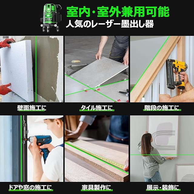✅【製品仕様】光源:緑色可視半導体レーザー 520nm。レーザー基準:クラス 2。水平精度:± 1mm/5m。垂直精度:± 1mm/5m。直角精度:±90°±0.1°。ライン幅:1.5mm/5m。動作時間:約 8 時間(全照射時)。仕事温度:-10℃~+50℃。防塵防水グレード: IP54。使用場所:室内、室外。