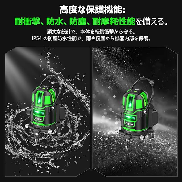 ✅【グリーンレーザー】B5 は高性能レーザーを採用することで、明るく見やすいラインを照射することができ、作業効率を向上させています。精密にラインを調節できるネジを採用しているのも特徴の一つです。現場作業に耐える高い防塵・防滴性能の IP54 仕様で、ちょっとした雨の日、荒れた環境下でも問題なく使用していただけます。