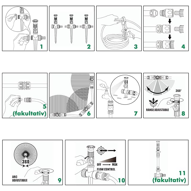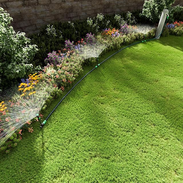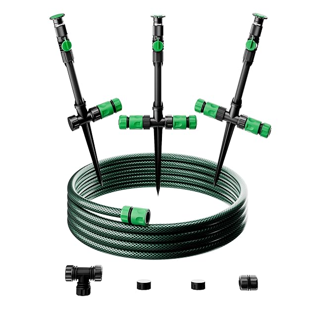 【梱包内容】この超柔軟なARC-N-RANGEスプリンクラーセットには、360°調節可能なスプリンクラーx3、13.2cmライザーx3、10m(30フィート)12mmガーデンホースx1、3ウェイホースコネクタx1、ホースメンダーx1、ホースコネクタ(1/2インチ)x6、タップアダプターx2が含まれます。