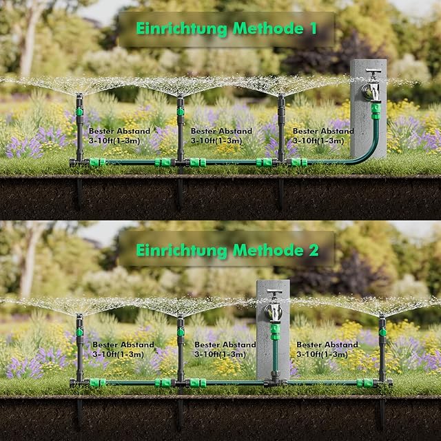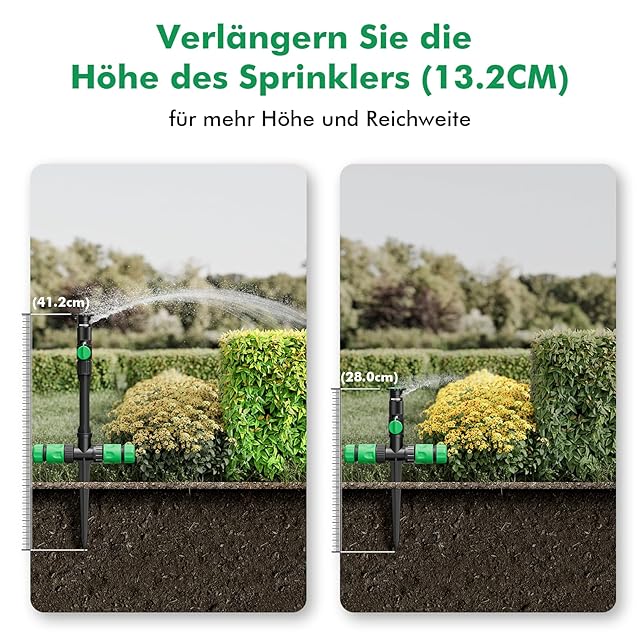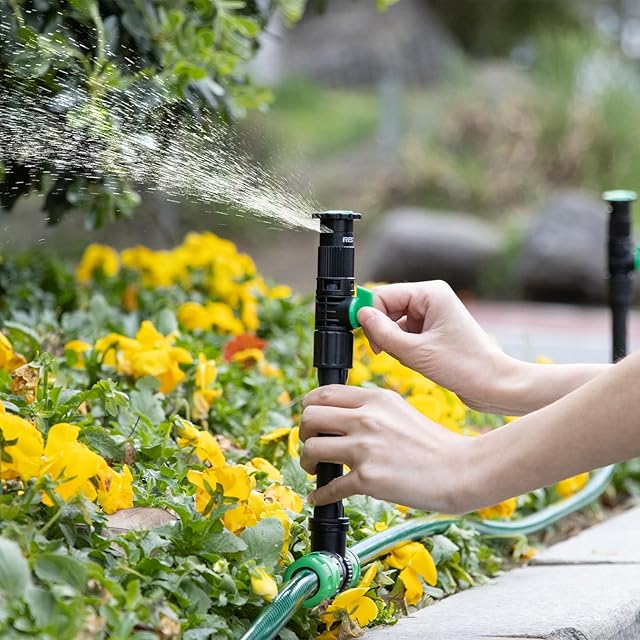 【調整可能なスプリンクラー】各スプリンクラーは10°〜360°の噴霧角度、off-max流量制御、360°の噴霧方向に調整できます。 パッケージには 3 つのライザー (13.2cm) が含まれており、スプリンクラーを拡張して背の高い植物に届くようにすることができます。