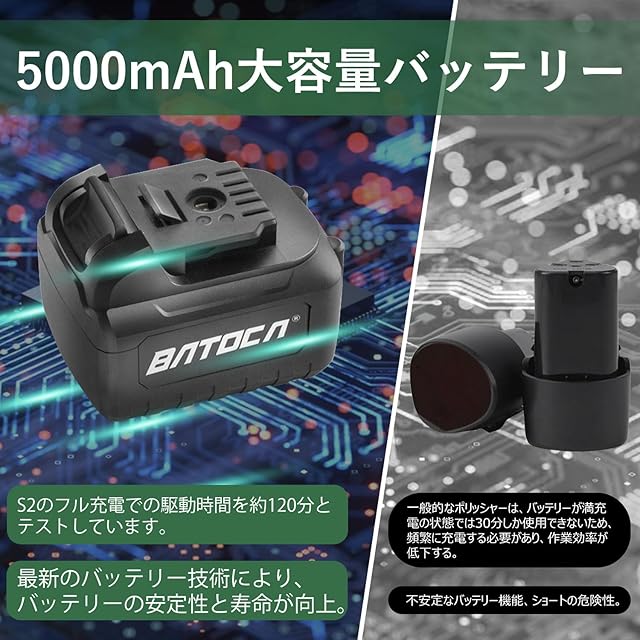 【高出力5Ahバッテリーパック】 BATOCA S2は大容量5Ahリチウムイオンバッテリーを搭載。当社ラボテストではフル充電時(無負荷・3速)で約120分間の連続稼働を確認(実際の作業時間は圧力や速度設定により変動)。標準装備の2本のバッテリーで途切れない作業を実現。追加用バッテリーも選択可能(ASIN: B0C48NBC4T)。