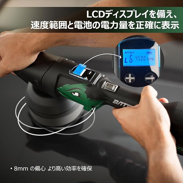 BATOCA S2 ポリッシャー ダブルアクション 車 コードレス 充電式 カー ポリッシャー 125mm 5.0Ah大容量 12V バッテリー2個付属 6段変速 2000-4500RPM 車/バイク用 ヘッドライト 磨き 艶出し・傷消し LCD画面搭載 日本語説明書付き