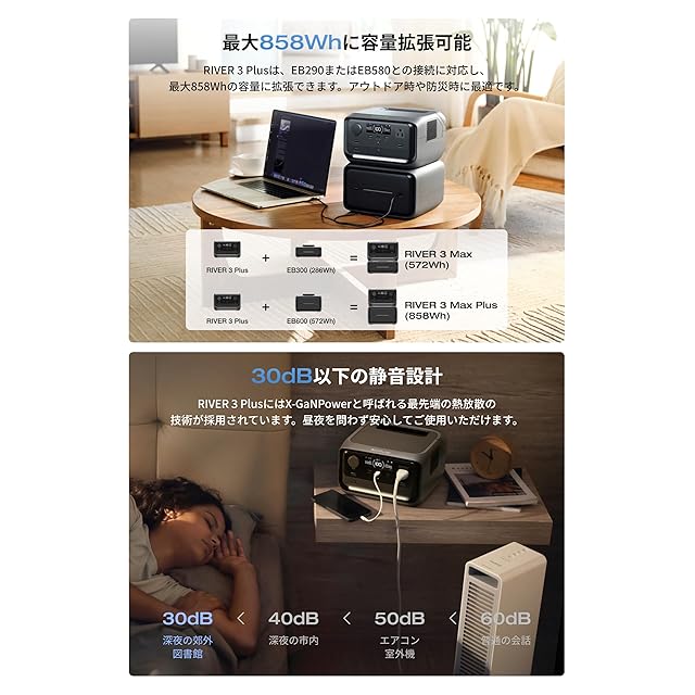 【最大858Whに容量拡張可能】アウトドア時には本体やエクストラバッテリーを手軽に持ち出せ、防災時には容量を拡張して長時間のバックアップを得ることができるため、安心感を得られます。RIVER 3 Plusは、EB290(286Wh)またはEB580(572Wh)との接続に対応し、最大858Whの容量に拡張できます。