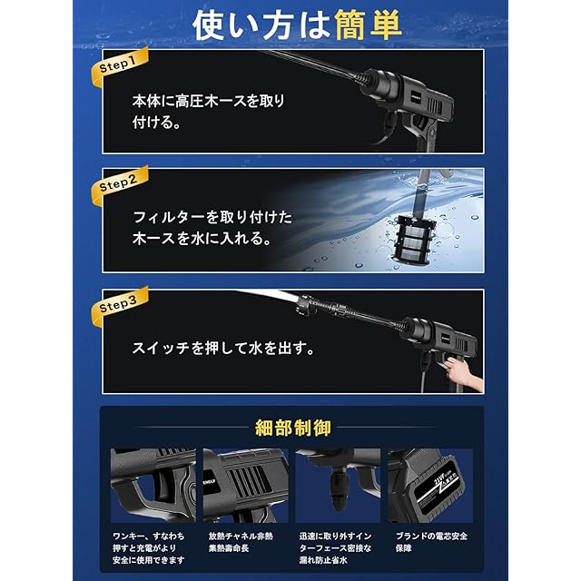 【自吸式給水&フィルター付き】本製品は自吸式給水ので、蛇口を接続する必要がなく、過機能付きフィルターと給水パイプで、バケツの水を使うことができます。長いホースを搭載し、湖、川、やためておいた雨水などの水を使用する時にとても便利です。専用タンク不要で使用場所を選びません。なお、バッテリー式なので、使い勝手が非常に良い、屋外での作業や車の洗車などに最適です。水道代を節約する同時に、掃除も楽になります。※本製品はカーボンブラシモーターを採用しているため、トリガーを引くと製品内部で一瞬スパークが発生してから作動します。正常の挙動ですのでご安心ください。