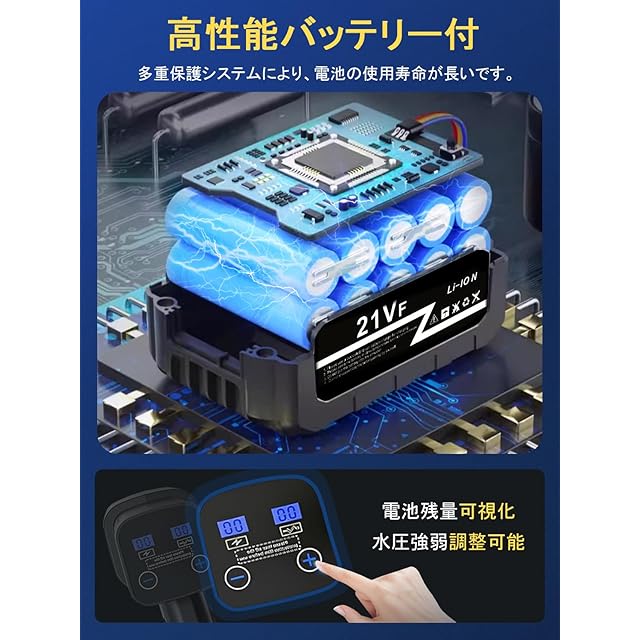 【高性能バッテリー付き・使用が安全】洗車用高圧洗浄機は一目でわかるディスプレイ画面搭載、画面の表示により、モード調整や電池残電確認ができます。高性能バッテリー付き、コンセプトに接続する必要がありません。この高品質のリチウムイオン充電バッテリーには、特な保護回路チップを搭載し、バッテリーの過充電·過放電·過電流を末然に防ぎ、いつでもご安心に使用いただけます。「ご注文:この製品はテスト後に出荷しているので水分が多少残っている場合はありますが製品の性能に問題はありません。」