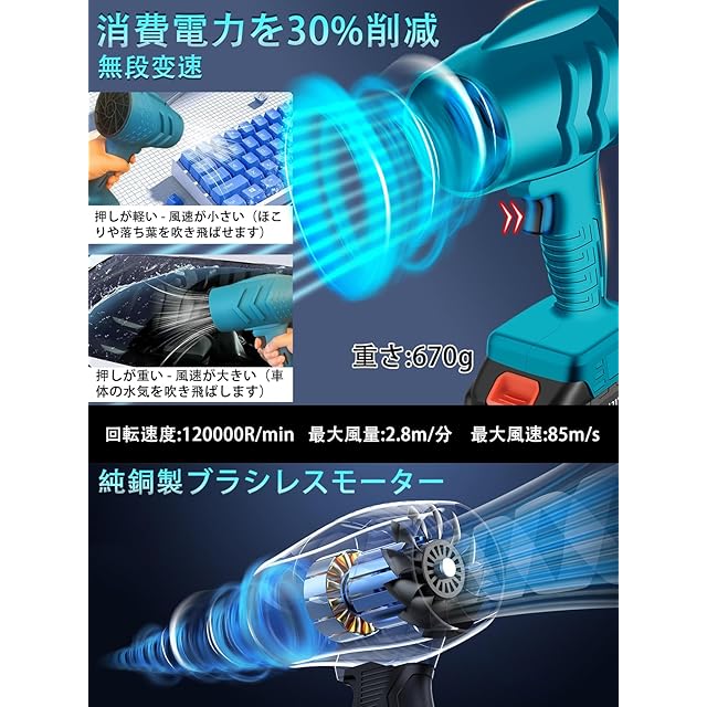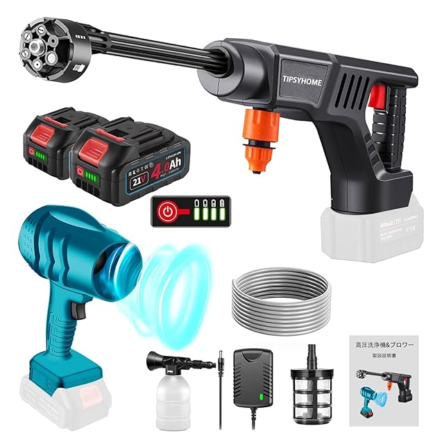 【2025新登場洗車セット】洗車機 高圧 洗浄機 コードレス 充電式 ブロワー付属(マキタ電池互換・長い寿命2本4Ahバッテリ残量表示付)車両用&庭落ち葉楽に掃除・無段階変速&自動水圧調整(8Mpa自吸タイプ水流が強いし・52dBとても静かです・1.3kg軽量・6in1防錆ノズル・5M延長ホース付き) 小型 家庭用 女性でも 操作が簡単 防塵・防水仕様なので PSE認証&日本語取扱説明書–黒青