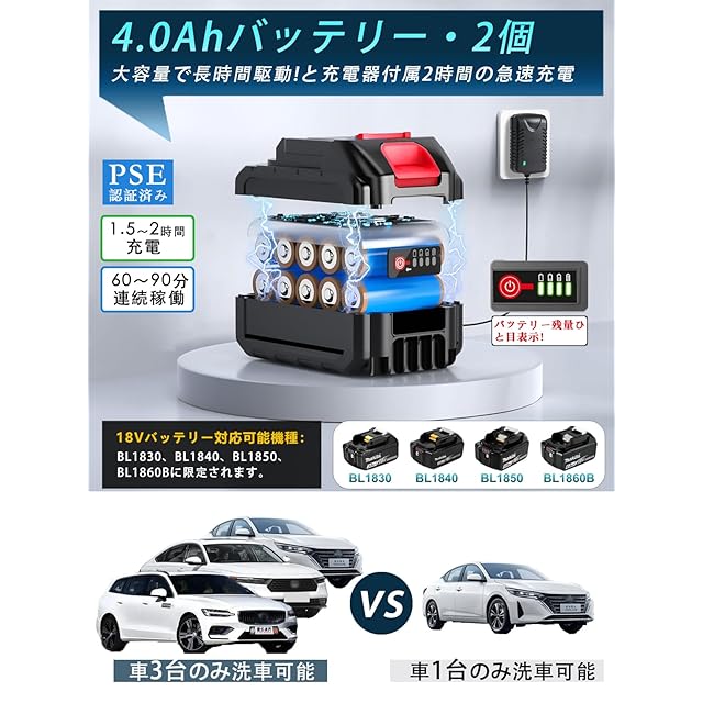 ❸【大容量バッテリーを2個で洗車勝手&純銅モーター&長寿命バッテリー】▼充電式高圧洗浄機は便利性と長時間駆動を両立しています。新エネルギ技術を採用して▼PSE認証済み4.0ahバッテリー2個付,一度の充電で驚異の最大60分連続稼働を実現。洗車なら一つで十分です。2つの電池を交換使用して、1回の充電で2~3台洗車可能。コードレス高圧洗浄機で面倒な準備は不要で、電池をパチッと装着するだけで、狭い場所でもしてすぐに清掃開始。電源のない屋外でもストレスフリーです。