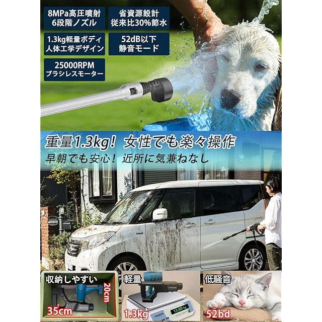 ❷【超軽量&コードレス設計 】▼女性/シニアも楽々操作する人間工学設計▼ 軽量1.3kg ワンタッチノズル交換握り部に滑り止めゴムを採用したコンパクトボディ。高圧洗浄機のホース延長は工具不要で3秒接続。▼軽量0.67kgブロワーは片手でも安定操作可能。関節への負担を最大40%軽減するバランス設計。