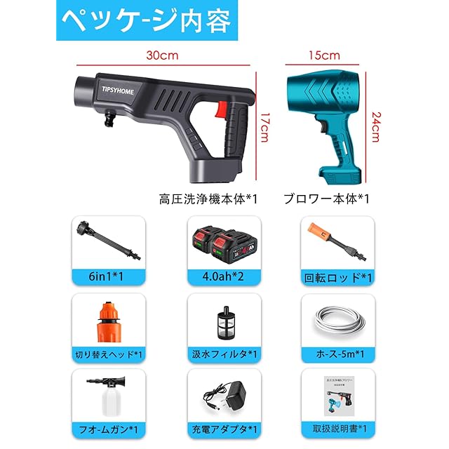 【付属充実&アフターサービス】高圧洗浄機本体*1、プロワ-本体*1、回転口ッド*1、6-in-1ノズル,大容量バッテリー*2、充電器*1、フォームノズル*1、カップリング*1、5m柔らかいホース*1、フィルタ*1、日本語取扱説明書*1。ご購入の日から1年間の商品保証があり、万が一商品は初期不良、部品の不足、故障などがありましたらアフターサービスチームまでお気軽にお問い合わせください。 ご注意:本品は出荷前にテストを行っているため、わずかな水分が残っている場合がありますが、性能に影響はありません。