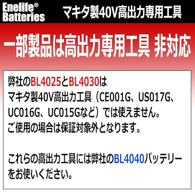 ◆2◆ <本製品> マキタ互換の40Vバッテリーで、最大瞬間放電電流60A、最大継続放電電流40Aで、ハイパワー工具にオススメのバッテリーです。 弊社のBL4025とBL4030はマキタ製40V高出力工具(CE001G、US017G、UC016G、UC015Gなど)では使えません。ご使用の場合は保証対象外となります。これらの高出力工具には弊社のBL4040バッテリーをお使いください。