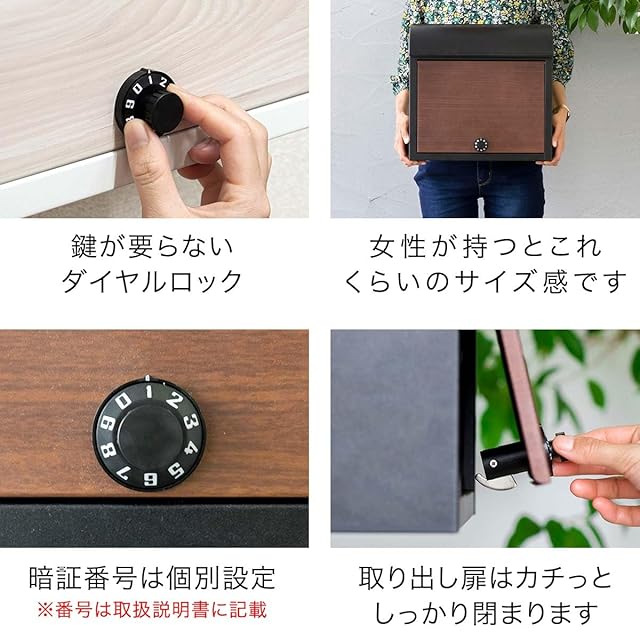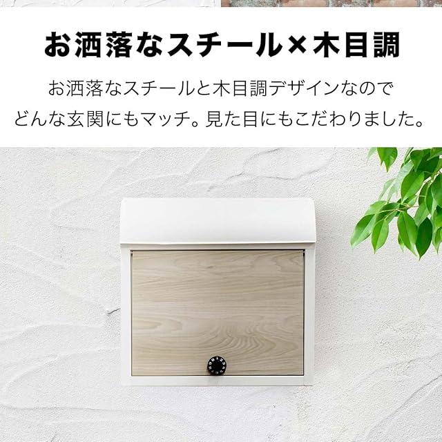 ✅【ダイヤルロック式の壁掛けポスト】 木目調デザインがお洒落な壁掛けポストです。投函口が隠れており、フタを開くと投函口が現れる仕様です。スタイリッシュに見えるだけでなく雨の侵入も防ぎます。 ✅【好きな高さに設置できる”壁掛け”】 壁掛けタイプなので、ご自身の身長に合わせて設置する高さを決める事ができます。毎日開けるものなので、ラクに取り出せる高さを見つけてください。 ✅【大きな投函口と取り出しすい扉口(メール便対応)】 厚みのあるカタログや、ビジネス封筒も角2まで入る広い投函口。収納力も抜群なので郵便物が沢山届いても大活躍です。