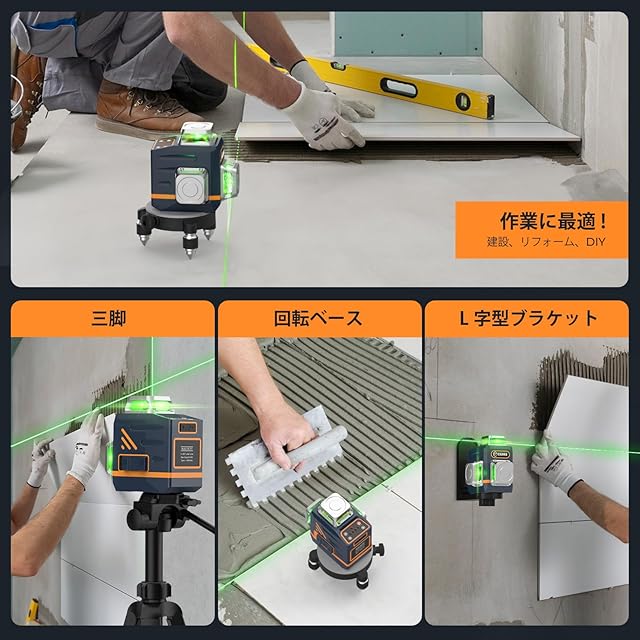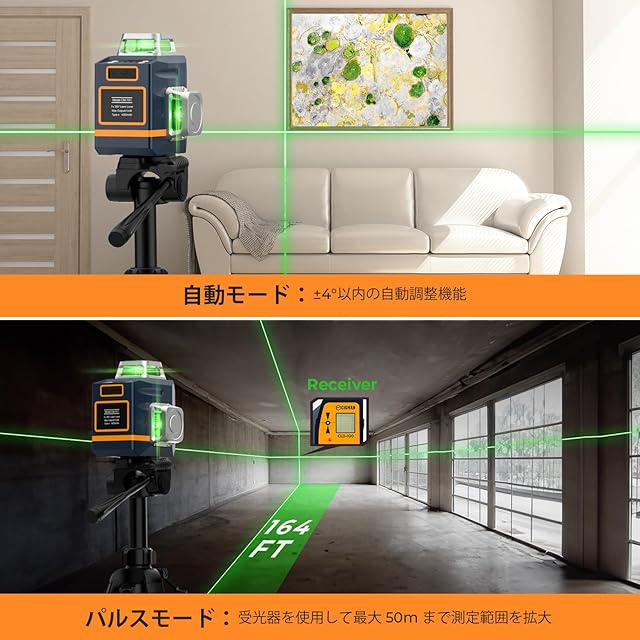 3つのモードで多様な用途に対応:このグリーンレーザー墨出し器は、以下の3つのモードを備えています。自動調整モード: 平坦な面で自動的に水平を確保し、簡単かつ正確なセットアップが可能です。手動モード: 角度を自由に設定できるため、複雑なレイアウトや創造的なプロジェクトに対応します。パルスモード: 明るい環境でもレーザーの視認性を高め、受光器を使用することで作業範囲を30mから50mまで拡大可能。屋外作業や大規模な室内作業に最適です。