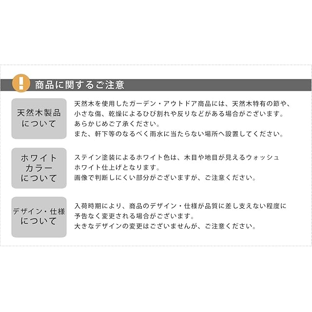 材質: 杉天然木(ステイン系塗装仕上げ) ※浸透性の塗料で木の質感を残した木肌(木目・節)のそのまま見えるナチュラルな塗装方法です(木材の地色や油分等の違いで色味に濃淡や個体差があります)。屋外木製品用の塗装でご使用当初は揮発臭がございます。 形状: 組立式