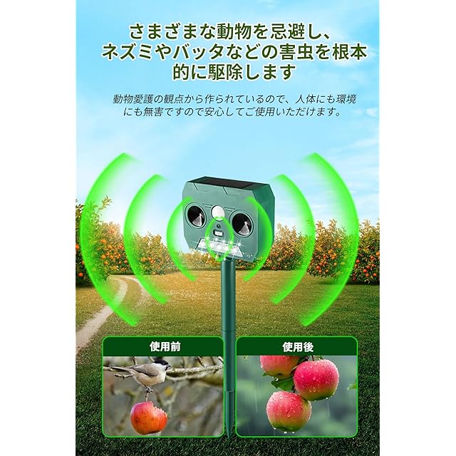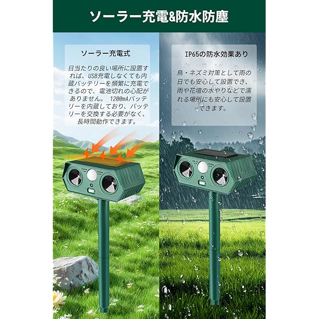 【ソーラー充電・防水防塵】環境に優しいソーラー充電システムを搭載しております。USBチャージ不要、繰り返し充電する必要はありません、日当たりのいいところに設置するだけで自動で充電します。さらに、IP65の防水・防塵性能により、雨の日でも安心して使用でき、常にあなたの庭を守ります。昼夜を問わず自動的に動作し、24時間中断されない作業モード、野生動物の侵入から、24時間あなたの家を守るために、本当に緑、環境保護、撃退するための省エネの方法。(長くお使いいただくために、台風や大雨などの悪天候の際には屋内保管推奨。)