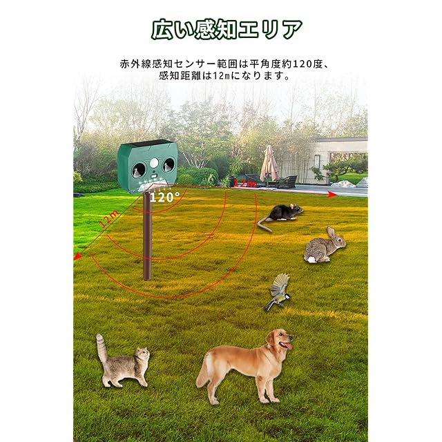 【広い検出範囲・動物を自動撃退】この猫よけは感知エリアは広くて、猫よけ超音波赤外線自働センサーは平面の角度が約120°、上下の角度が約55°のセンサー範囲を持って、感知距離の最大直径約10m-12mになります。動物が検出範囲に入る時、赤外線センサーで超音波スピーカーをトリガーし、音、警報。猫、鳥、犬、ネズミ、キツネ、ヘビ、リス、その他の動物を駆除します。糞害やイタズラを根本から解消することができます。花壇・庭・駐車場など色々な場所で活躍できます。(注意:使用環境、動物の大きさ、天気、製品の電量などによって、感知範囲に多少誤差があります。)