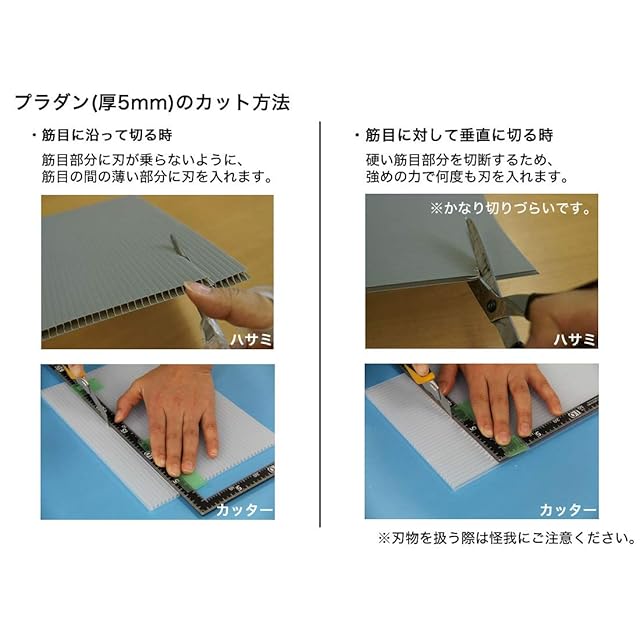 はさみでは切りづらい硬さです。カッターの場合も一度で切らず複数回刃を入れてください。少し力がいります。作業時は十分お気を付けください。