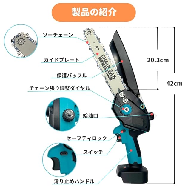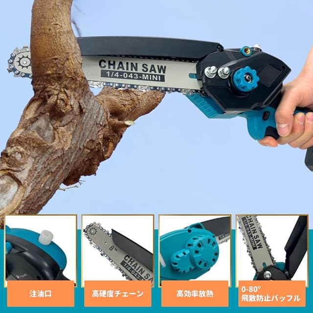 マキタ互換 8インチ 充電式 チェーンソー ブラシレスモーター 小型 オイル 給油 コードレス 電動 ノコギリ のこぎり 家庭用 18V 14.4V バッテリー 対応 Longsafe MCS801-BL ※ バッテリー 充電器 別売り