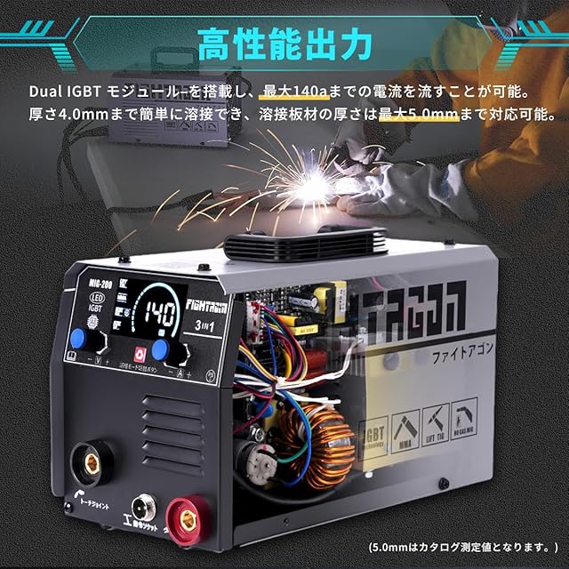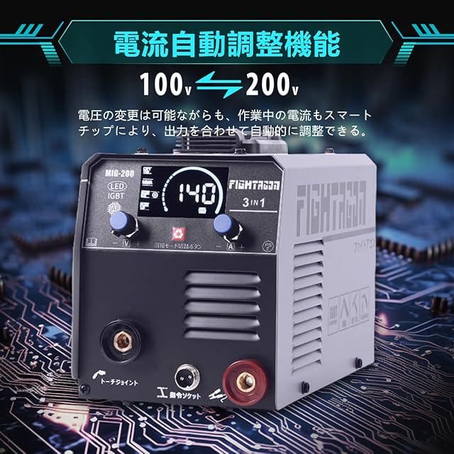 [FIGHTAGON]溶接機 半自動溶接機 MIG200 LED表示 防災 最大出力140A 1台3役 ノンガスMIG·被覆アーク·LIFT TIG 100V/200V兼用 50/60HZ ノンガス半自動溶接機 アーク溶接機 定格使用率60% インバーター搭載 小型 軽量 家庭用 初心者向け 説明書付き