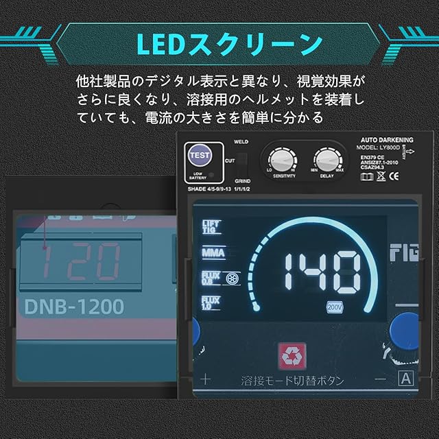 【LED表示】従来のデジタル表示と異なり、最先端なLEDスクリーンを採用し、他社製品より視覚効果が良く、溶接用のヘルメットを装着した後でも電流の大きさを簡単にわかります。細かく調整することができ、溶接作業を更に円滑になります。最大出力140Aで、5.5mmの厚板を溶接することが可能です。