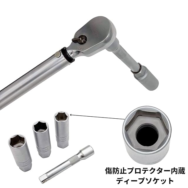 付属のディープソケットは傷防止プロテクターを内蔵、17、19、21mmの3サイズで一般的な乗用車のほぼ全ての各メーカー各車種のホイールナットに対応します。