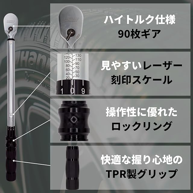 設定値に到達したときにクリック音とヘッドのアクションで締め付けを確認できます。従来のトルクレンチより低トルクから明瞭なクリックアクションが発生しオーバートルクを防止します。 本製品のDUALーDIRECTIONは正ネジだけでなく一部のトラックやオフロード車両、軍用車両に使用されている逆ネジのホイールナットや自転車の逆ネジBBなどにも対応可能です。 新開発の送り角度4度の90歯ギアラチェットは常に複数の歯がギアに接触しているため、ギア滑り、ギアとびがなく安全に作業が可能です。ラフな操作でも正確に切り替わる偏向性レバーは作業中に不用意に切り替わる心配がありません。 調整用のロックリングは、設定したトルク値で自動的にロックされるので、使用中に誤ってずれる心配はありません。 レーザー刻印スケールはハイコントラストで視認性に優れています。 ゴルフのドライバーなどのグリップとして多く利用されているTPR(サーモプラスチックラバー)製グリップは衝撃吸収性、耐久性に優れしっとり吸いつくようなフィット感が特徴です。