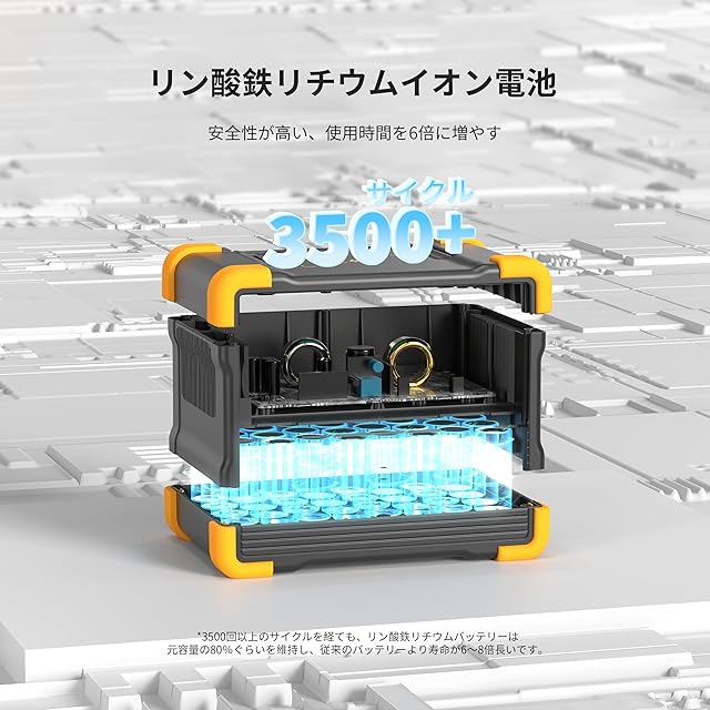 【6倍の長寿命&3,500回以上の充放電サイクル】 リン酸鉄リチウムイオン電池を採用し、3,500回の充放電サイクル後でも80%以上の初期容量を維持。業界平均の約500回と比較して圧倒的な長寿命を実現しました。1日1回の使用で約10年以上使用可能です。また、有害金属を含まず環境に優しい設計で、耐熱性にも優れており、過酷な環境下でも安心してご使用いただけます。さらに、本体には耐衝撃性に優れた新素材を採用し、持ち運びにも安心です。