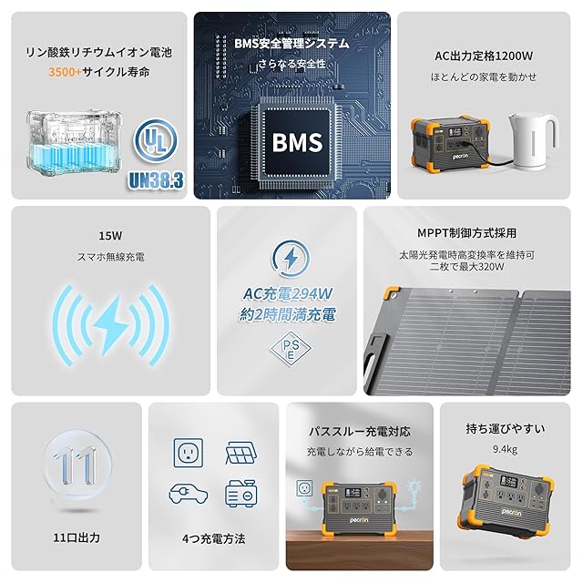 ⚡【静音&高速AC充電】 独自開発の「UBSF」充電技術を採用し、安全性とスピードのバランスに優れ、ACアダプターによる約3時間でのフル充電を実現。充電中も動作音が非常に静かで、室内でも快適にご利用いただけます。さらにMPPT機能搭載で、200Wのペクロン製ソーラーパネル2枚を使用すれば、約2時間でのフル充電も可能です。BMS(バッテリーマネジメントシステム)により、安全性も万全です。