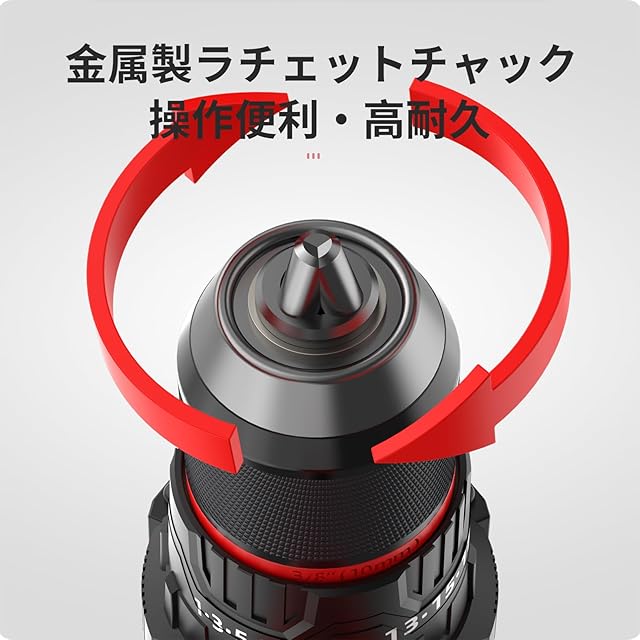 【LEDライト・大容量リチウム電池】当充電式ドリルはLEDライトが付きますので、作業中に機械の先端にあるLEDライトが点灯しますので、暗い場所でも安心して作業ができます。リチウム電池が2個付いていますので、日曜大工や家具の組立て、DIYなど家庭用の方にも、プロの工事現場にも活躍できます