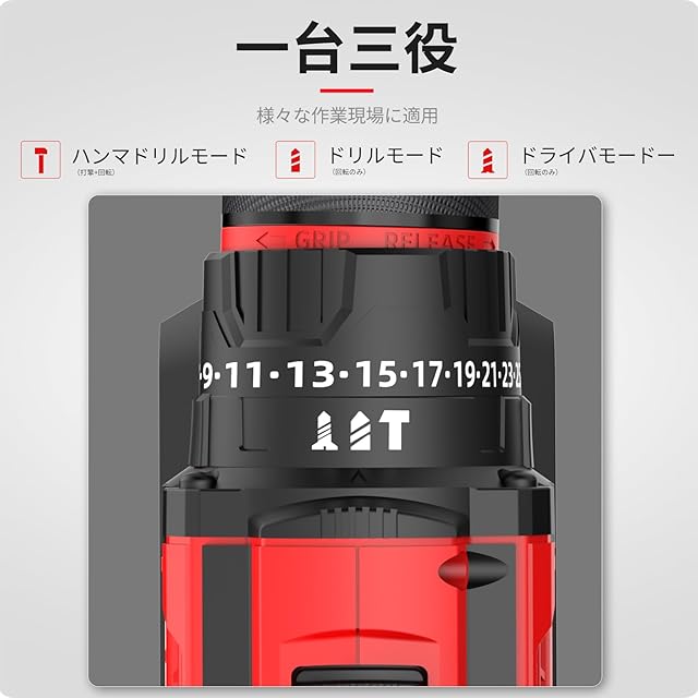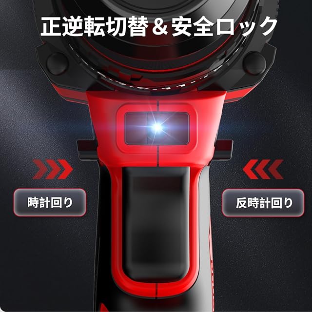 【プロ仕様2段変速】高速モード(0-1,800rpm)はコンクリート穴開けに最適、低速モード(0-450rpm)は精密ネジ締めを可能に。正逆転スイッチは中央ロック式で、誤操作防止。玄人向けのトルク調整リング(20段階)で、素材に合わせた最適な締め付け力が設定できます。