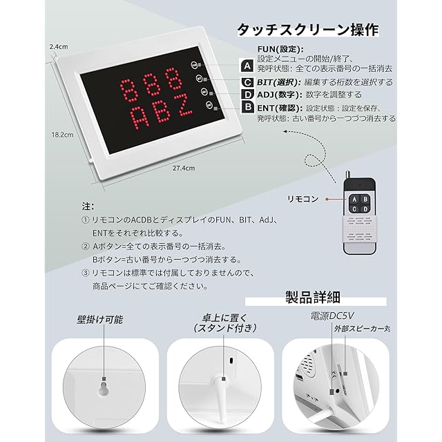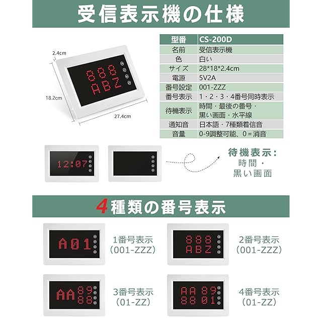【機能紹介】2024.7Ver.受信掲示板:高輝度LED 呼び鈴 ワイヤレス、接触式スクリーン、小型軽量、卓上・壁掛け用。番号設定:001-ZZZ(数値:0-9,英字: A-Z)。4つの表示モード:1組3桁、2組3桁、3組2桁、4組2桁。10段階の音量調整:0-9、0=無音。放送モード:日本語・着信音(7種類)。待機時間表示可能。