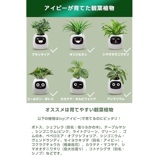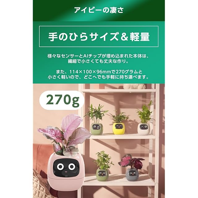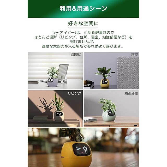 【AI知能&自動養護&AIペット】①光の露出を感知。日が当たらない室内ばかりで、少しブルーな気分のIvy(アイビー)。そうだ、そんな時は太陽に当てれば元気100倍になるよ!②土壌水分センサーが探知。水分不足に陥ったIvy(アイビー)、喉が渇いて声もでない!誰か、今すぐIvy(アイビー)に水を上げて、早く元気を取り戻して~!③タッチセンサーが作動。手に取ってあげると、喜んでいるIvy(アイビー)を見ながらこちらもニンマリ笑顔。④高度なタッチセンサー搭載。葉っぱをタッチするだけで、可愛いIvy(アイビー)が思わず反応!もう一回、触っちゃおうかなぁ~!⑤光センサーが感知。カーテンを開けて光が入ると、思わずIvy(アイビー)を起こしてしまうかも...しかも、一緒に寝起きを共にしている日常がスゴイ!⑥振動センサーで環境音や振動を観測。静かになったIvy(アイビー)も環境音や周りの振動にもちゃんと反応!嬉しいことに、いつもIvy(アイビー)から元気をもらってます!