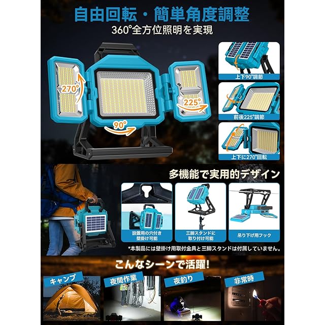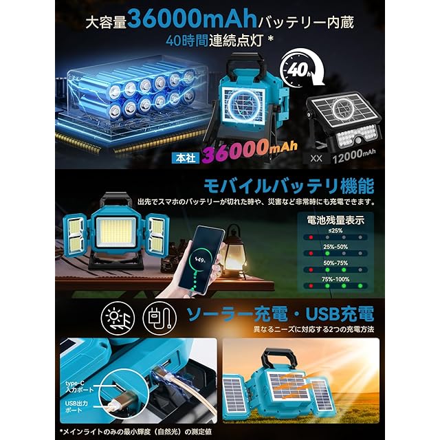 【USB急速充電・ソーラー充電・長寿命・省エネ・高効率】USB急速充電機能により、投光器はさまざまな状況ですぐに電力を補充できます。家庭用コンセントでもモバイル電源でも、素早く便利に充電でき、使いやすさが向上します。ソーラー充電により、投光器にグリーンエネルギーのオプションが追加されます。屋外や停電時でも、太陽光を利用して継続的に電力を供給できるため、従来の電力への依存を軽減できます。使用の持続性が向上します。この非常灯は、長いバッテリー寿命と多様な充電方法により、自然災害、停電、緊急事態の際に信頼性の高い光源保護を提供し、屋外活動や緊急救助の安全性とセキュリティを強化します。さらに、ランプビーズの定格寿命は30,000時間以上で、長寿命・省エネ・高効率を実現します。