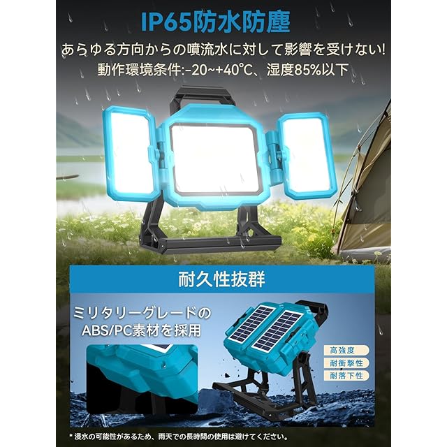 【IP65防水防塵・防衝撃性UP・高品質素材】密封性に優れ、IP65レベル高い防水・防塵性能を実現!製品の安全のため、水に浸さないでください。また、ミリタリーグレードのABS/PC素材を採用し、高強度の性能を持ち、落下や衝撃に対して優れた安定性を発揮します。頑丈な構造により保護性が向上し、偶然の落下や衝突による損傷を効果的に軽減します。 内部部品の安全性を確保し、照明器具全体の耐用年数を延ばします。 高い耐衝撃性により、投光器は、外部からの衝撃による機能不全を心配することなく、屋外の冒険、建設現場、または過酷な環境での使用に適しています。さらに、従来モデルより15%軽量化され、持ち運びにハンドル付き、より便利な体験を提供!