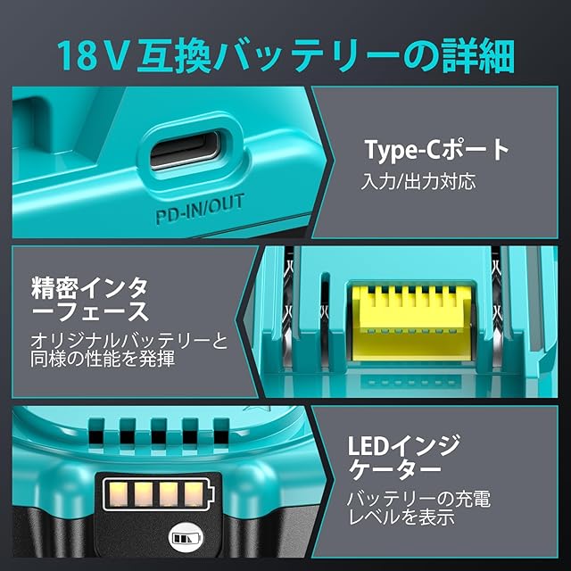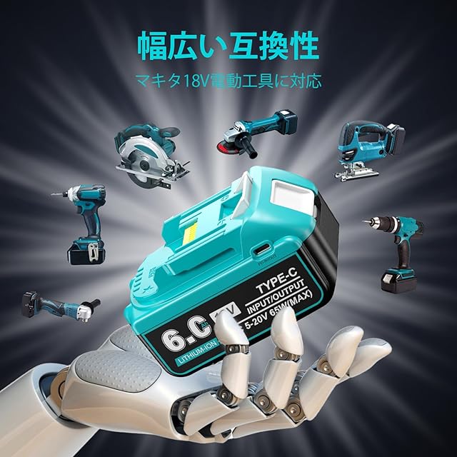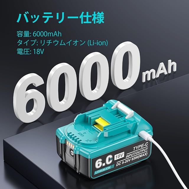 【ユニークなタイプC充電設計】電動工具用18V バッテリーはタイプC直接充電ポート付き、20V/3A PD 65W MAX入力により わずか90分で満充電可能。そして4段電池容量LEDインジケーターライト表示見えます。バッテリーはどのくらい容量があるか一目瞭然で安心します、大容量電池、6.0Ahの高容量電動工具によって、作業時のスピードとパワーが増加または減少し可能です.長時間使用できるバッテリーで、作業効率を向上。